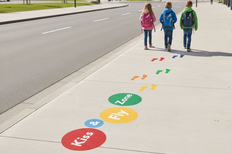 Neben spielerischen Markierungen sorgen wir auch für klare Strukturen im Verkehrsbereich Ihrer Einrichtung. Die Streetline Markings GmbH appliziert Piktogramme für Kiss & Fly Zonen, um den Bring- und Holverkehr vor Schulen und Kitas optimal zu regeln.